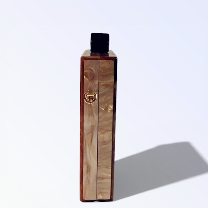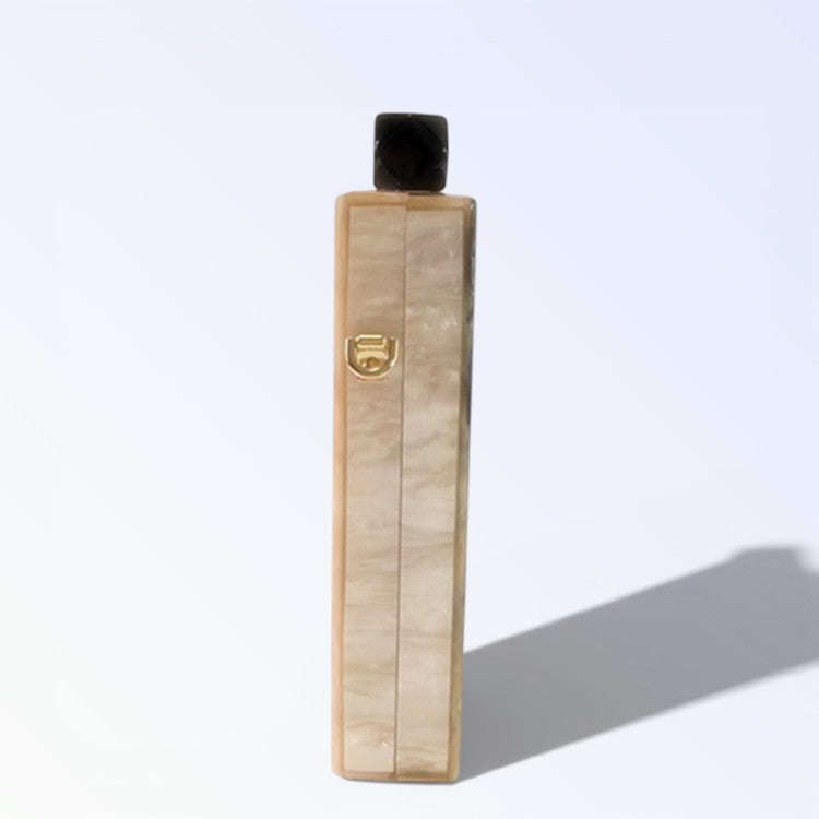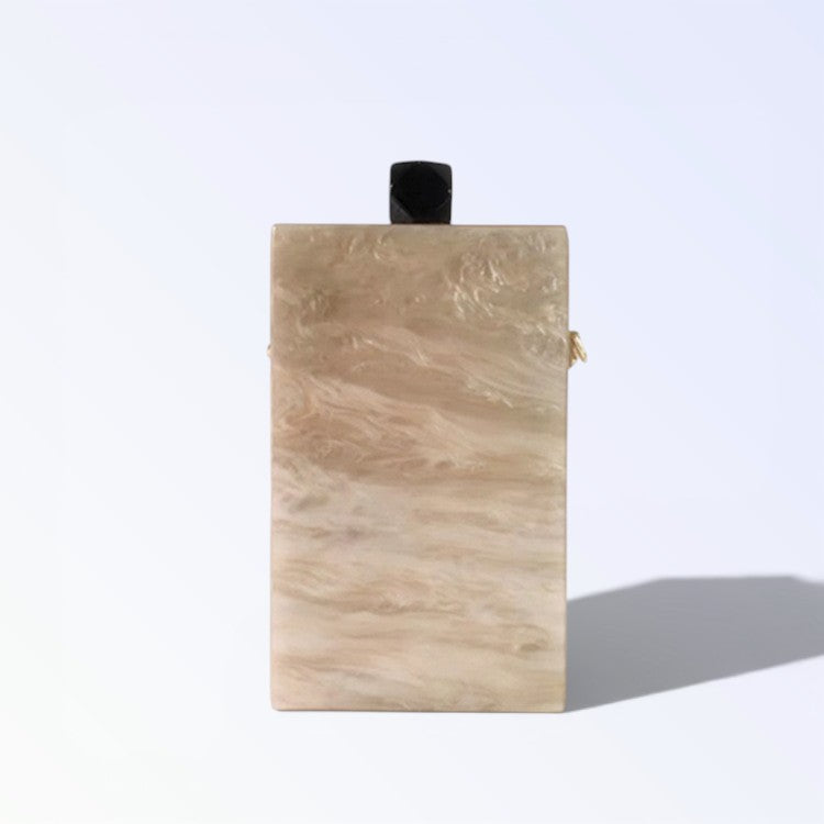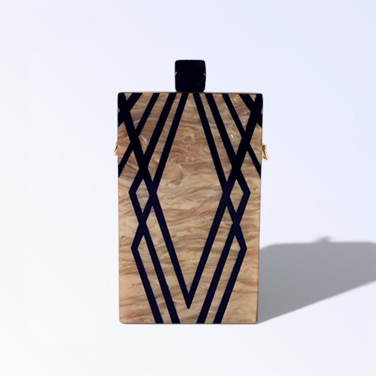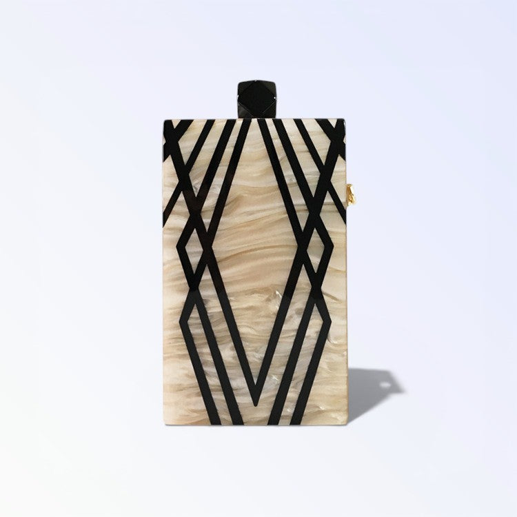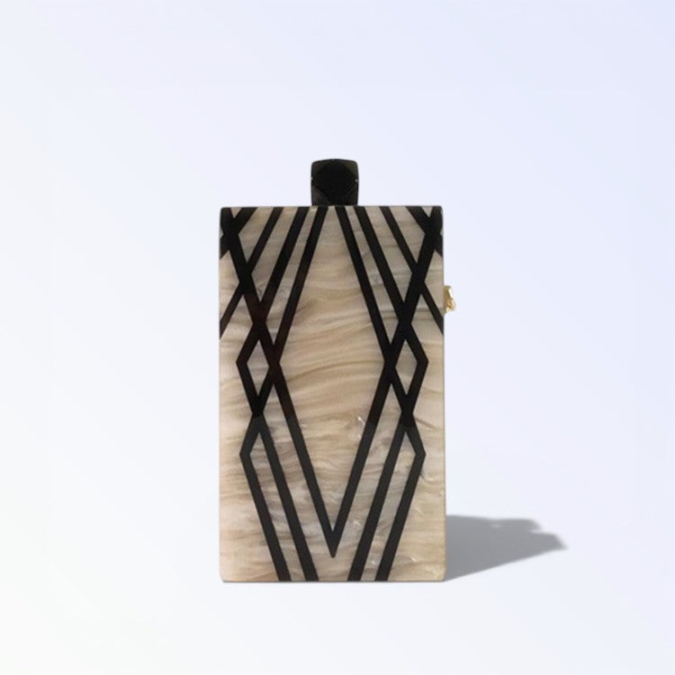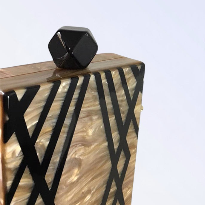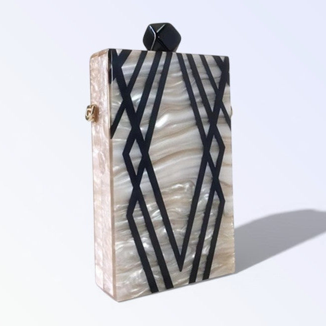 A MINERVA reluz na mão com madre-pérola luminosa entrecruzada por traços pretos rectilíneos, puxador quadrado escuro fixando elegância geométrica para ocasiões KUKA refinadas. O efeito nacarado muda com ângulos gerando brilho vivo, ideal para túnicas soltas ou fatos tailhados. Peça nacarada para luxo estruturado.