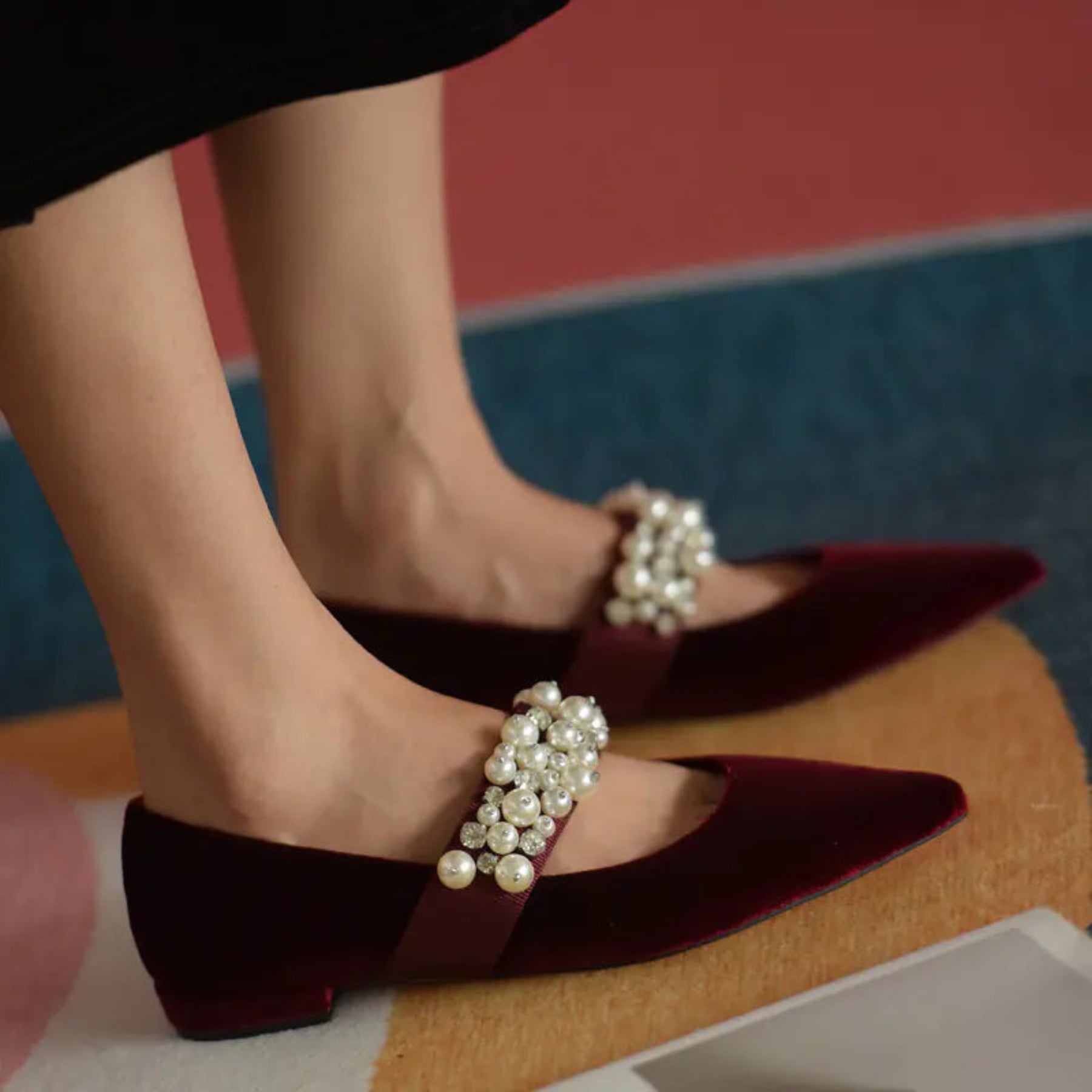 Descobre estas deslumbrantes sabrinas Mary Jane com tiras de pérolas, que combinam na perfeição o charme vintage com o conforto moderno. Cada par é cuidadosamente feito à mão para garantir qualidade excecional.