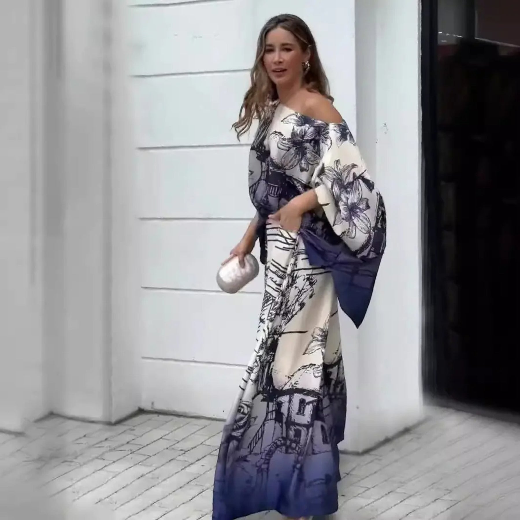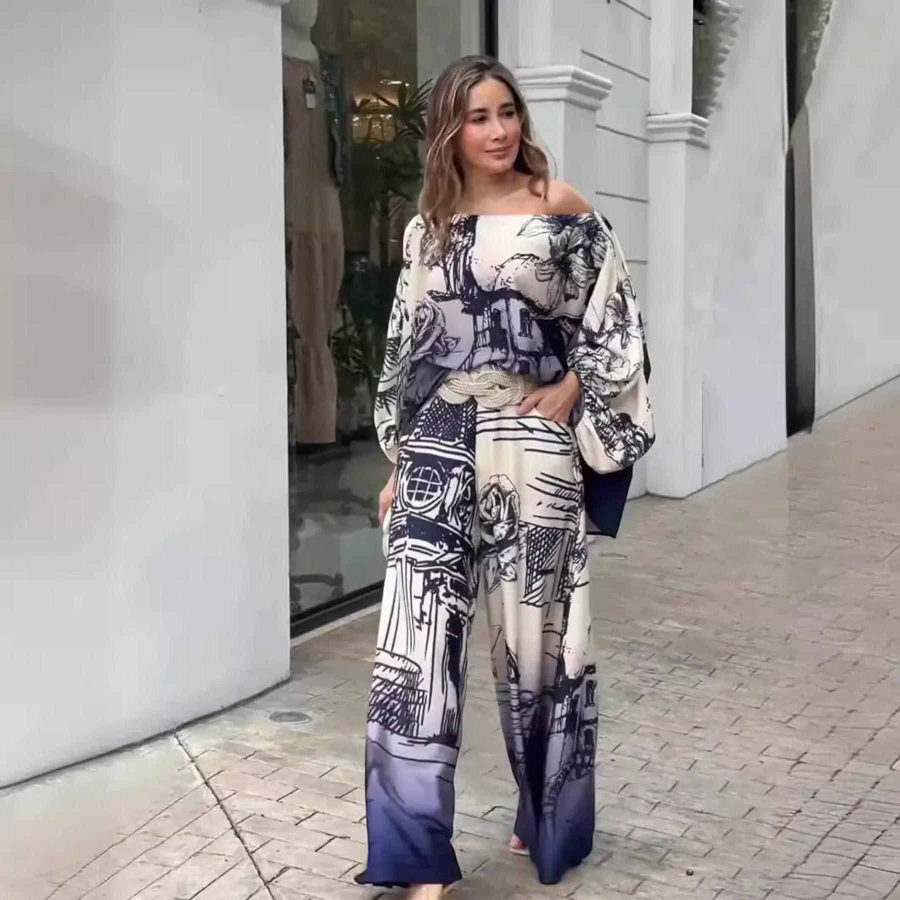 Elegância premium em design de duas peças. Conjunto com top batwing e calças de pernas largas que combina tradição e modernidade.