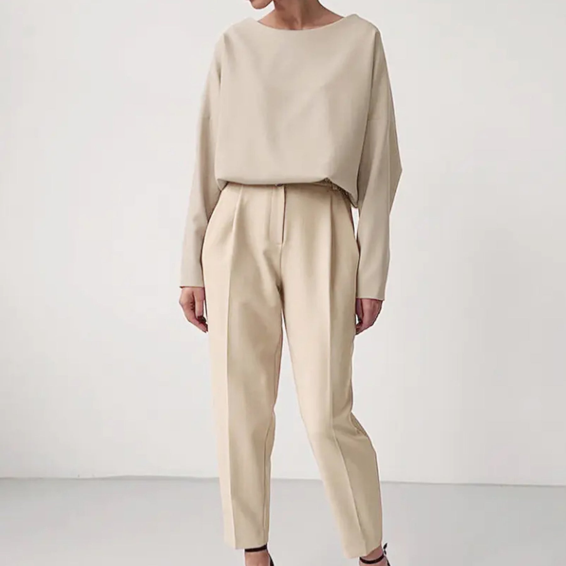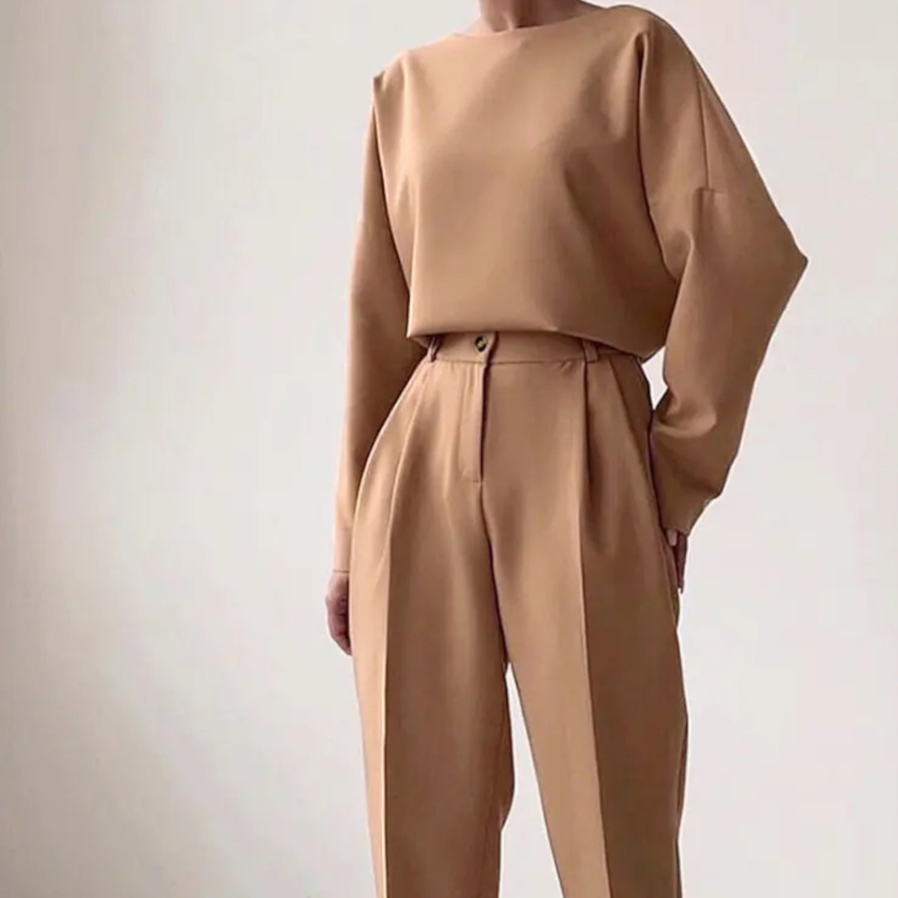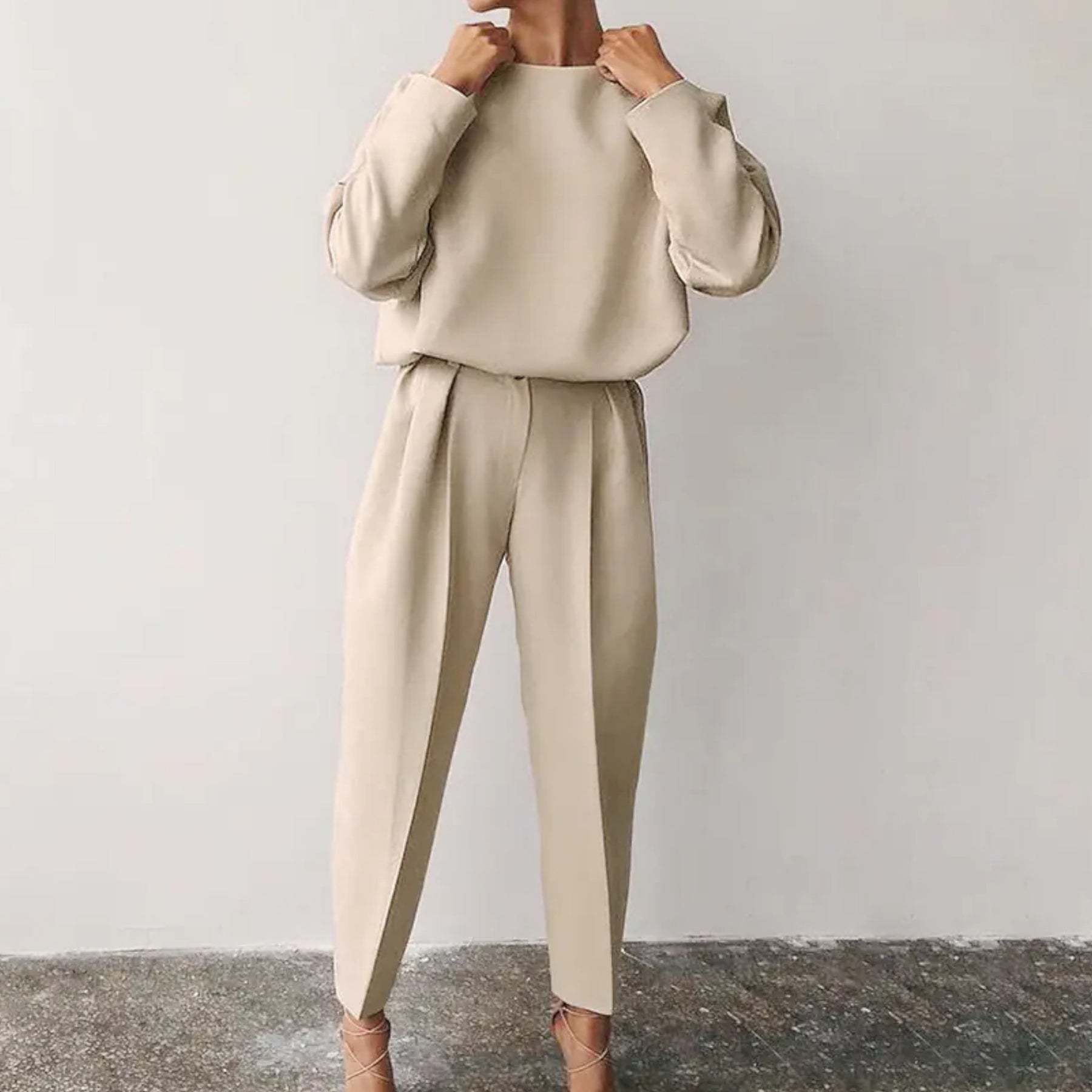 Elegância premium em design de duas peças. Conjunto camisola e calças direitas que combina tradição e modernidade.