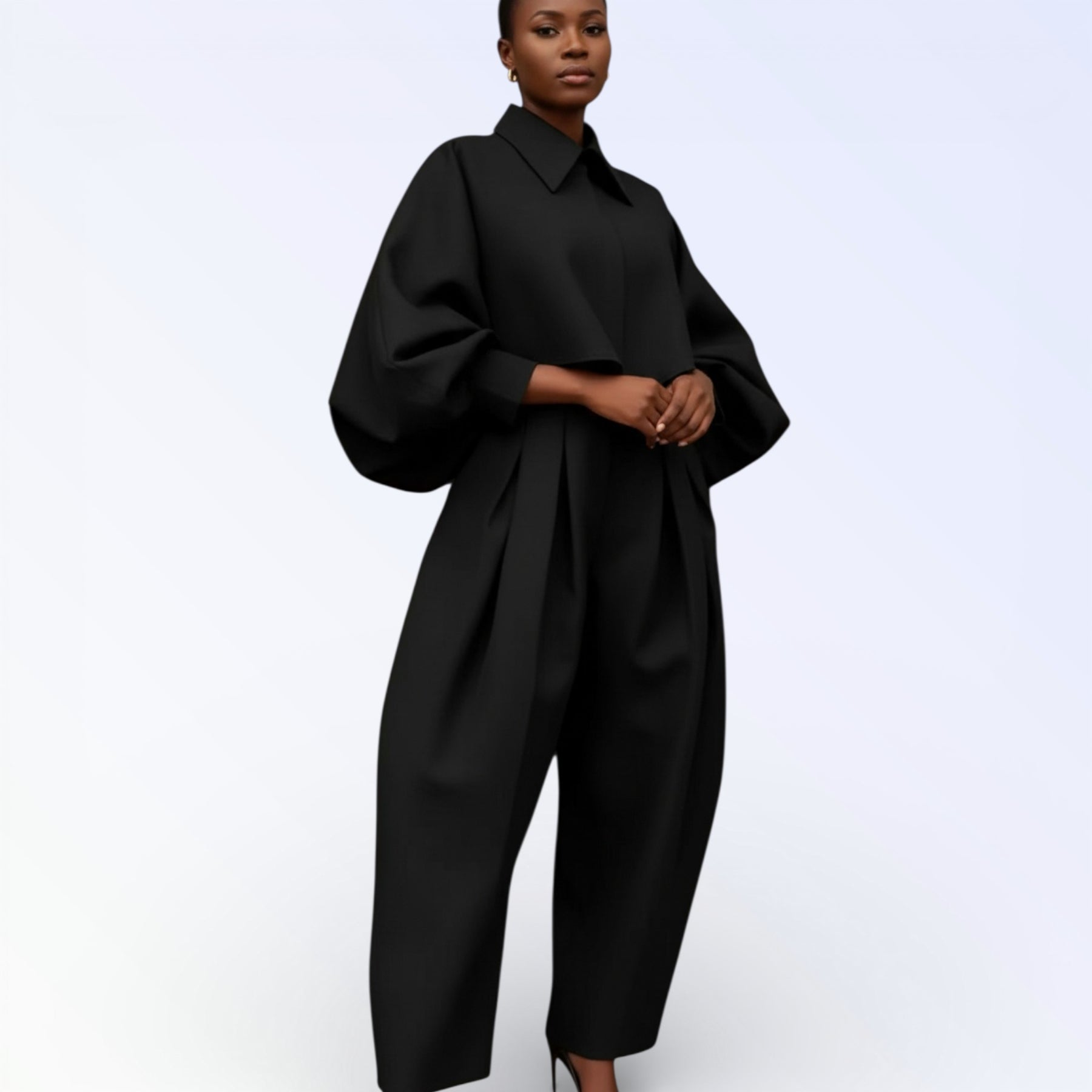 O ALVURA com camisa de colarinho e mangas super bufantes, aliada a calças plissadas de corte largo e fluido. O volume dramático nas mangas cria presença imediata, enquanto as calças dão movimento e conforto a cada passo. Feito em tecido estruturado mas leve, é a escolha ideal para eventos impactantes, escritórios ousados ou noites de gala onde quer comandar o espaço com confiança absoluta.