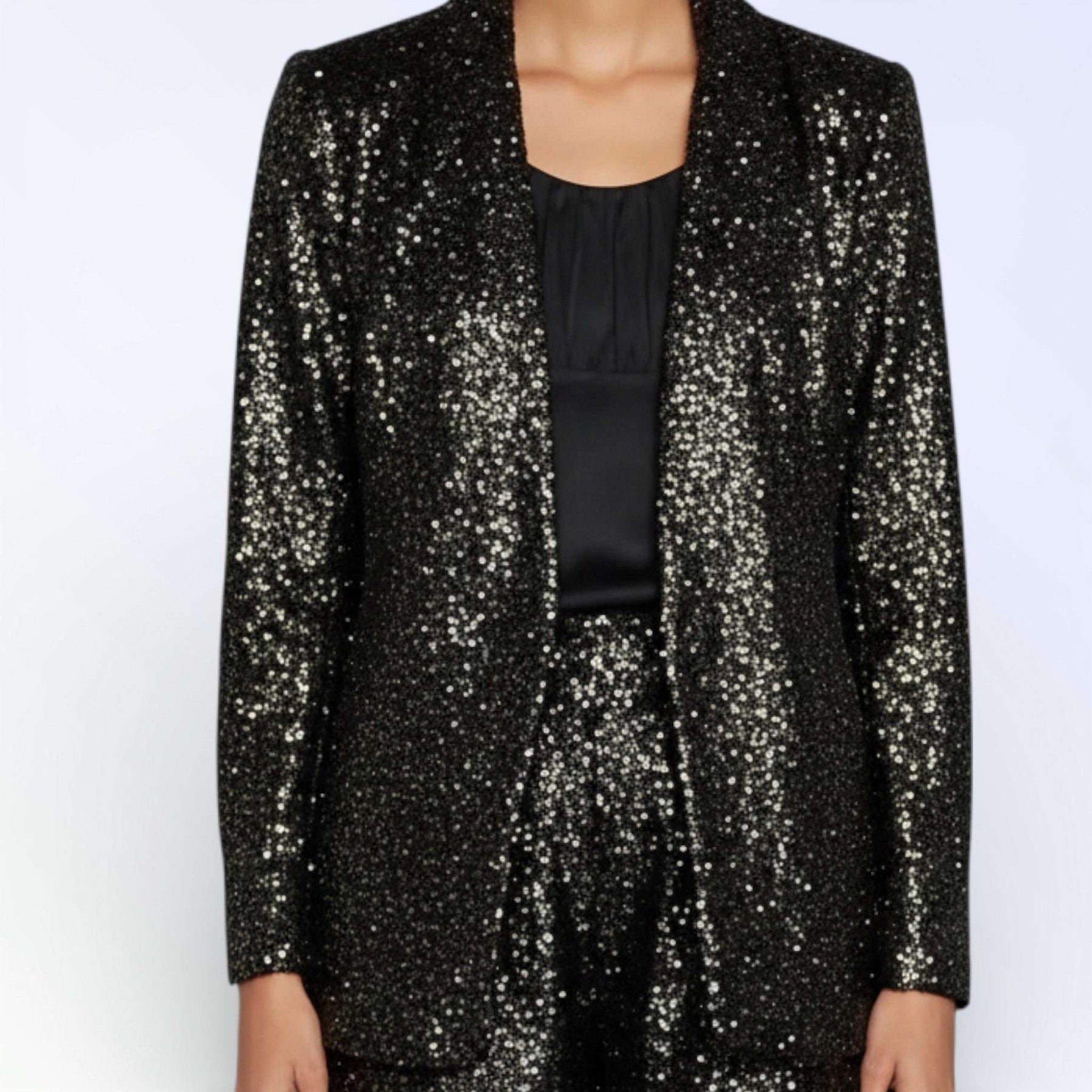 • Blazer em lantejoulas com corte reto, pensado para assentar de forma elegante sobre tops, camisas ou vestidos.