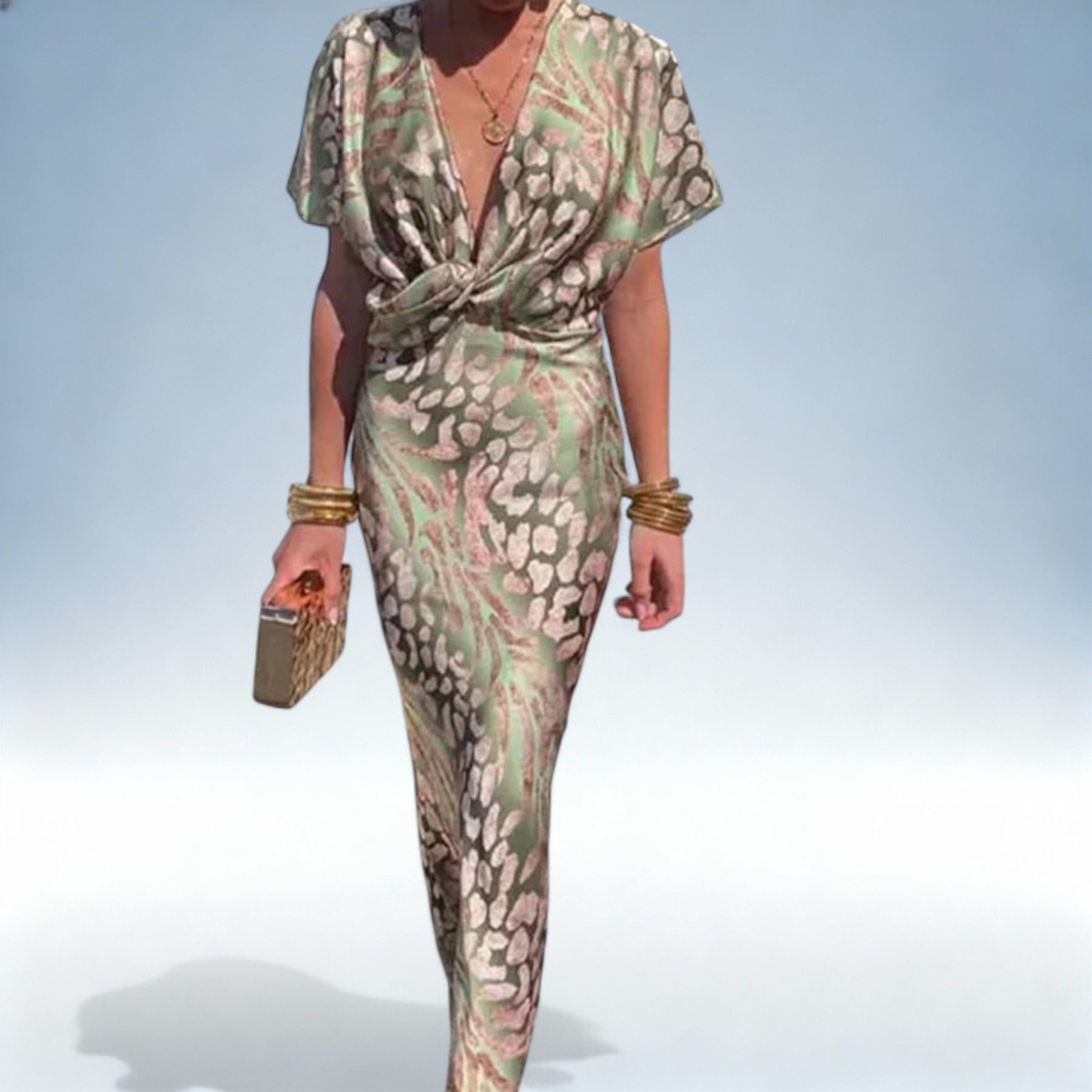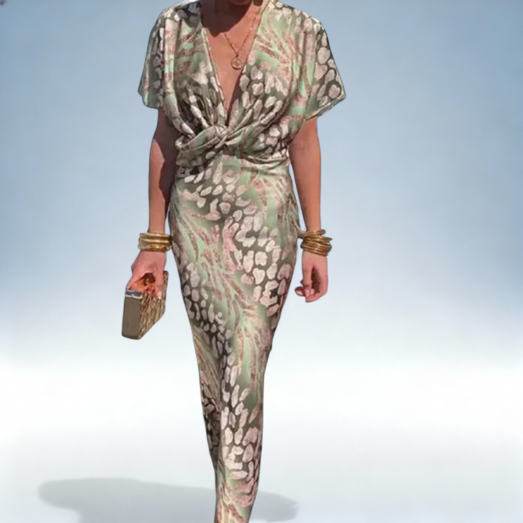 Destaca-te com estilo com o vestido SOPHIA — a peça elegante que transforma qualquer look com um toque de sofisticação moderna e charme atemporal! Leve e confortável, este vestido em cetim de poliéster premium destaca-se pelo design V-neck favorecedor e estampado vibrante, perfeito para ocasiões casuais, eventos formais ou para adicionar um toque chic ao teu dia a dia.