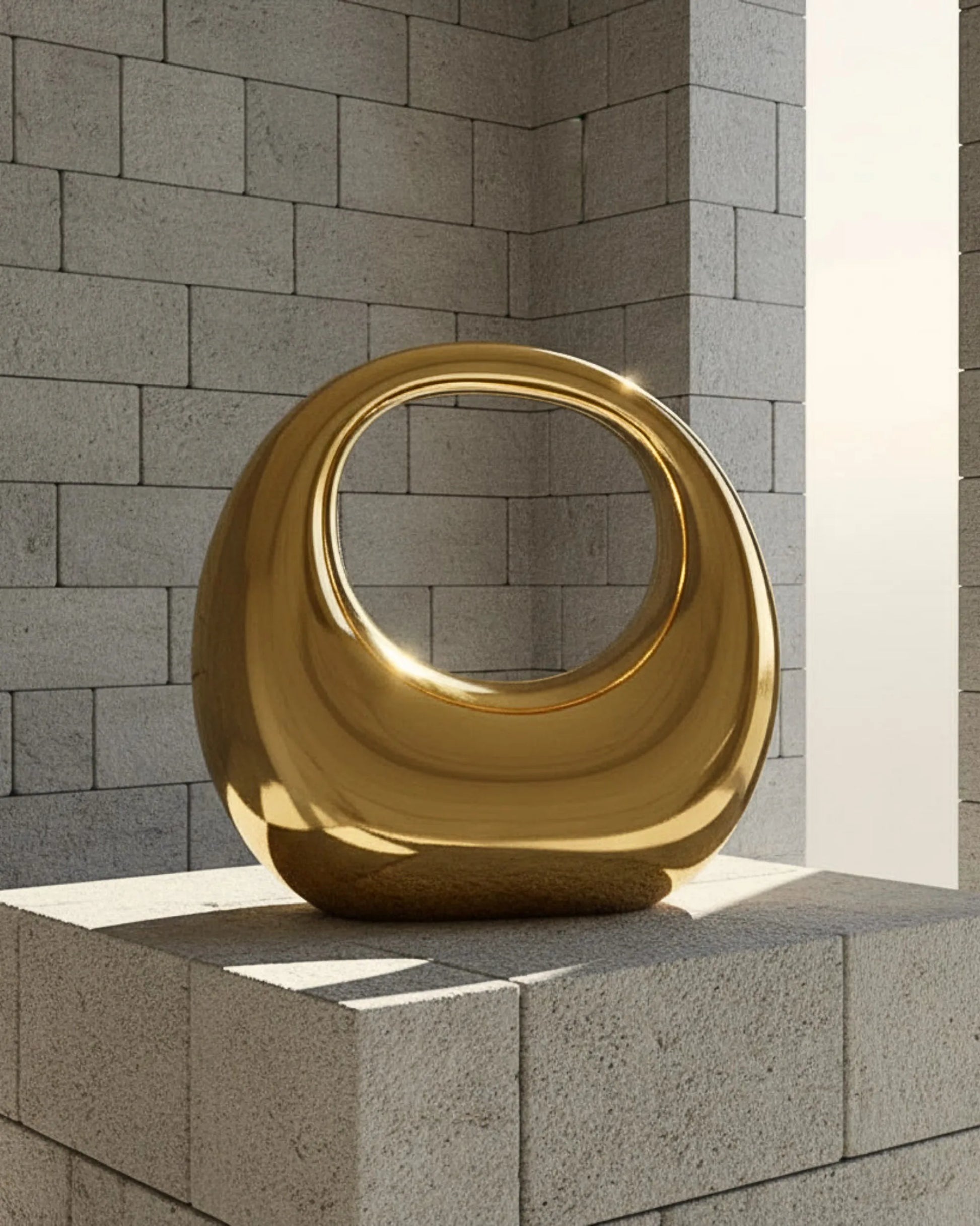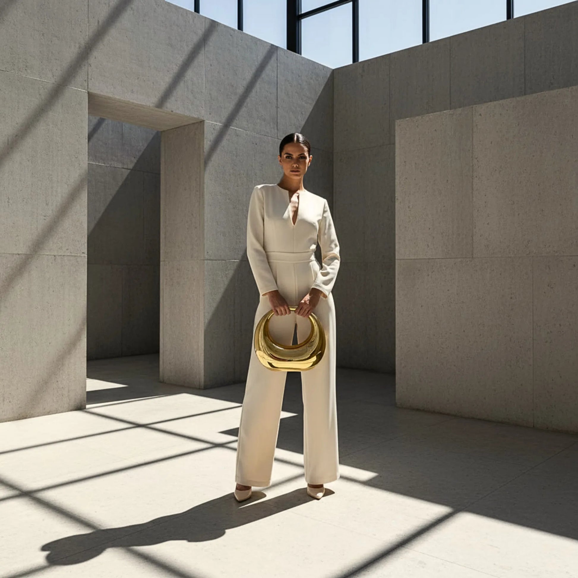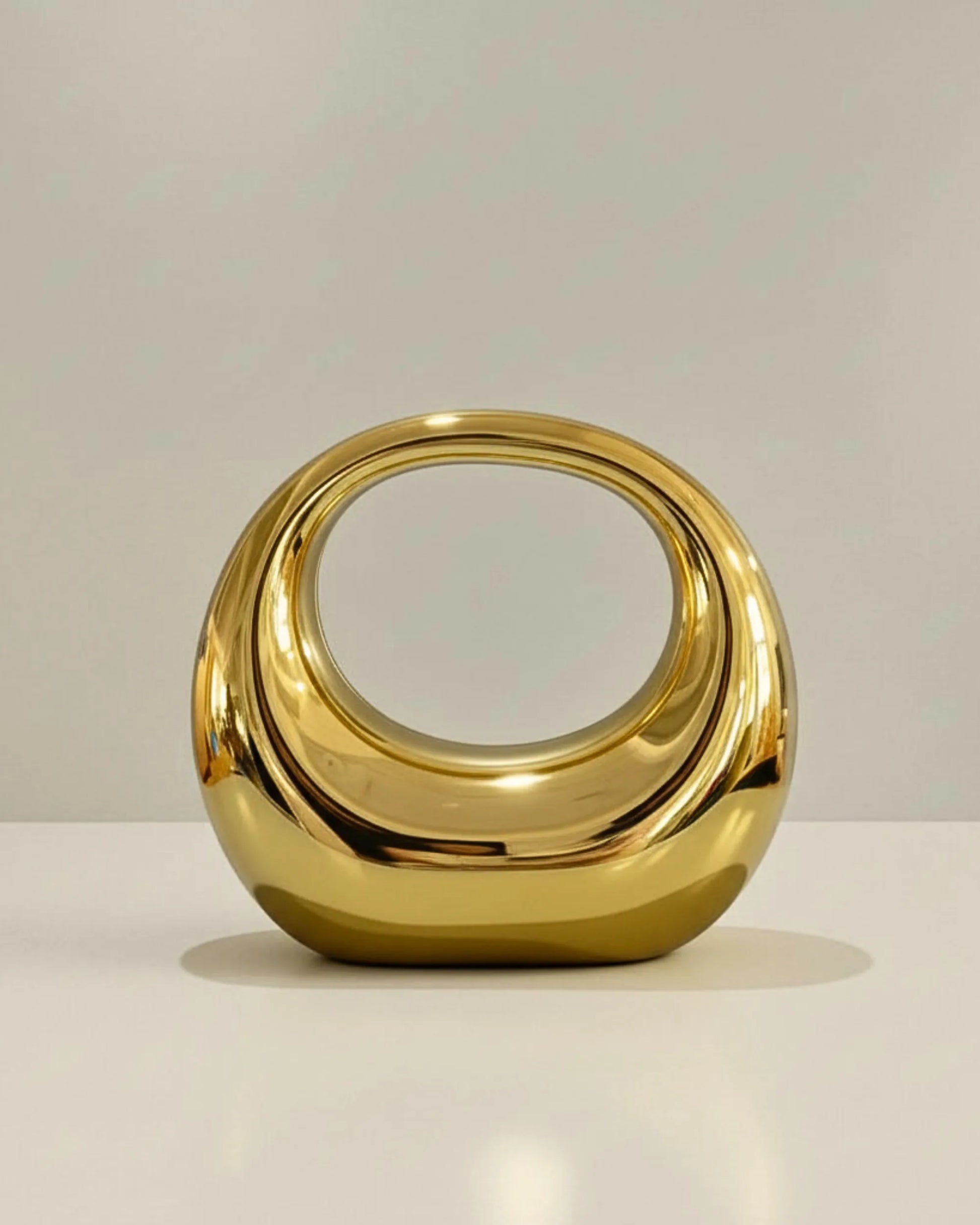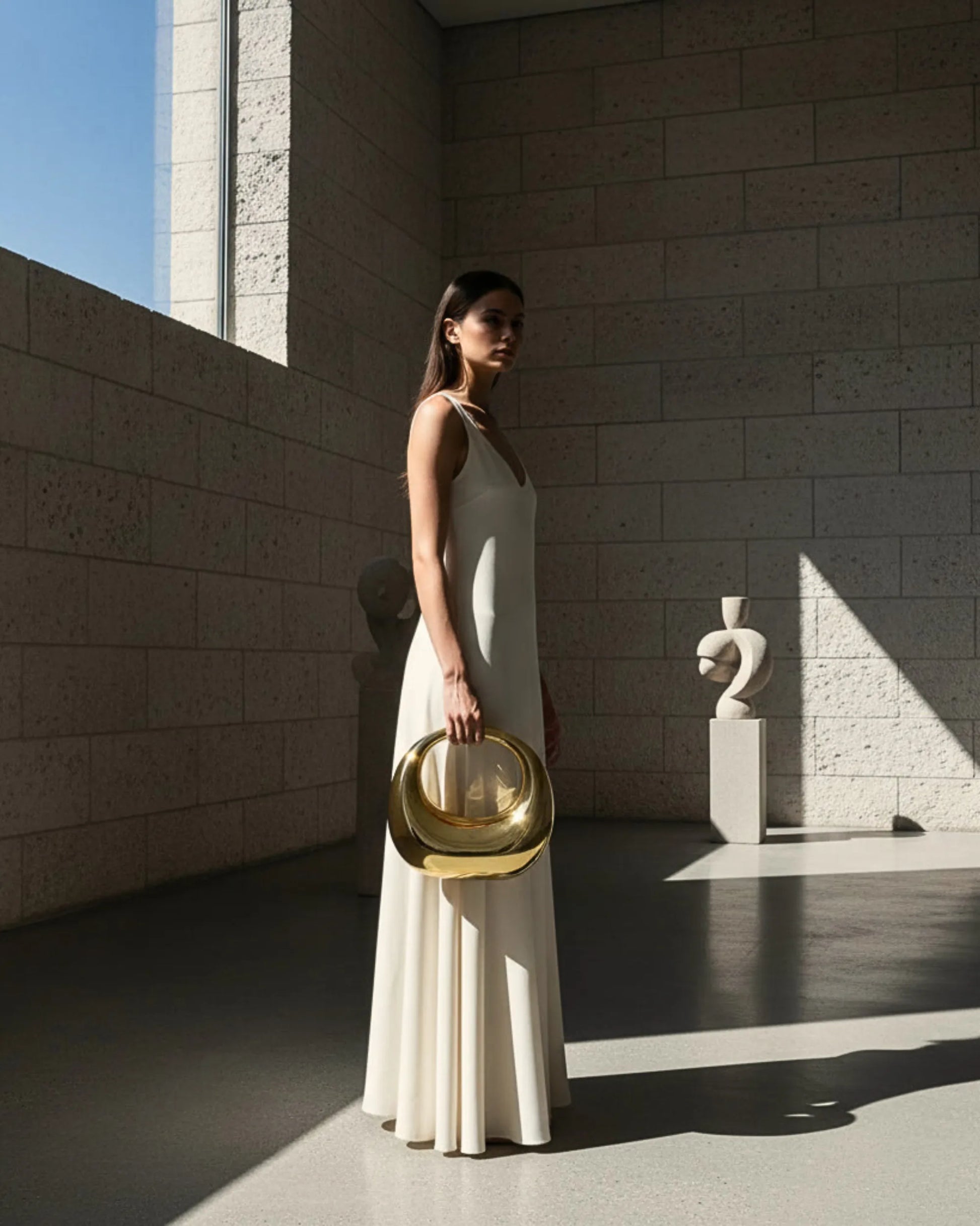 A mala Arco é um objeto de design puro. O acabamento espelhado capta o ambiente e torna-o parte do look, enquanto a geometria de arco dita uma rigidez sofisticada. É a peça de escolha para eventos onde a mala não é um acessório, mas a protagonista do discurso estético.