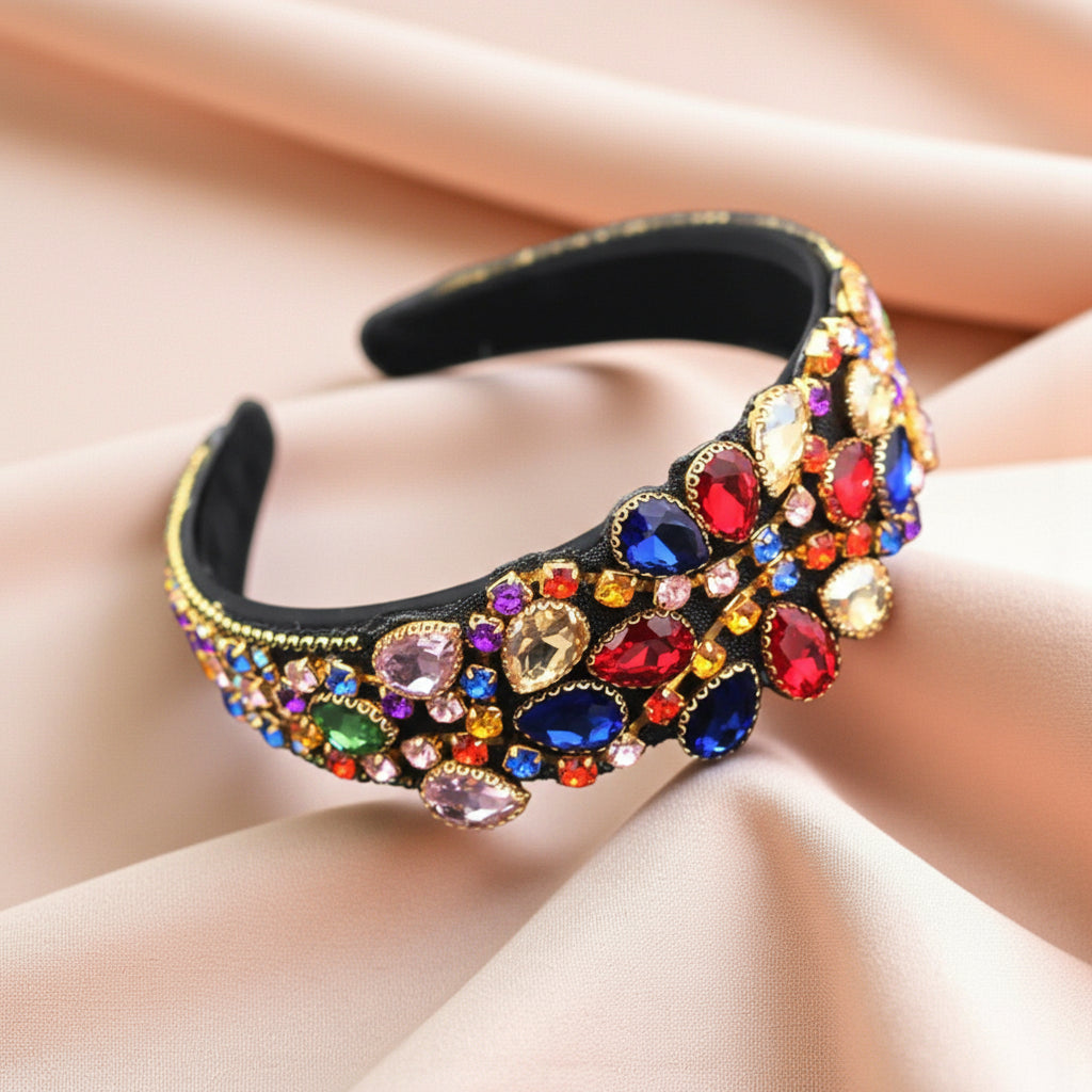 Elegância premium em cristais coloridos sofisticados com design ornamental. Bandolete que combina tradição e modernidade.