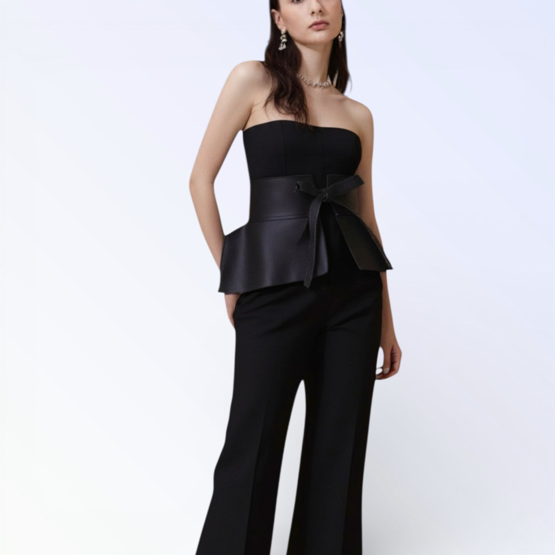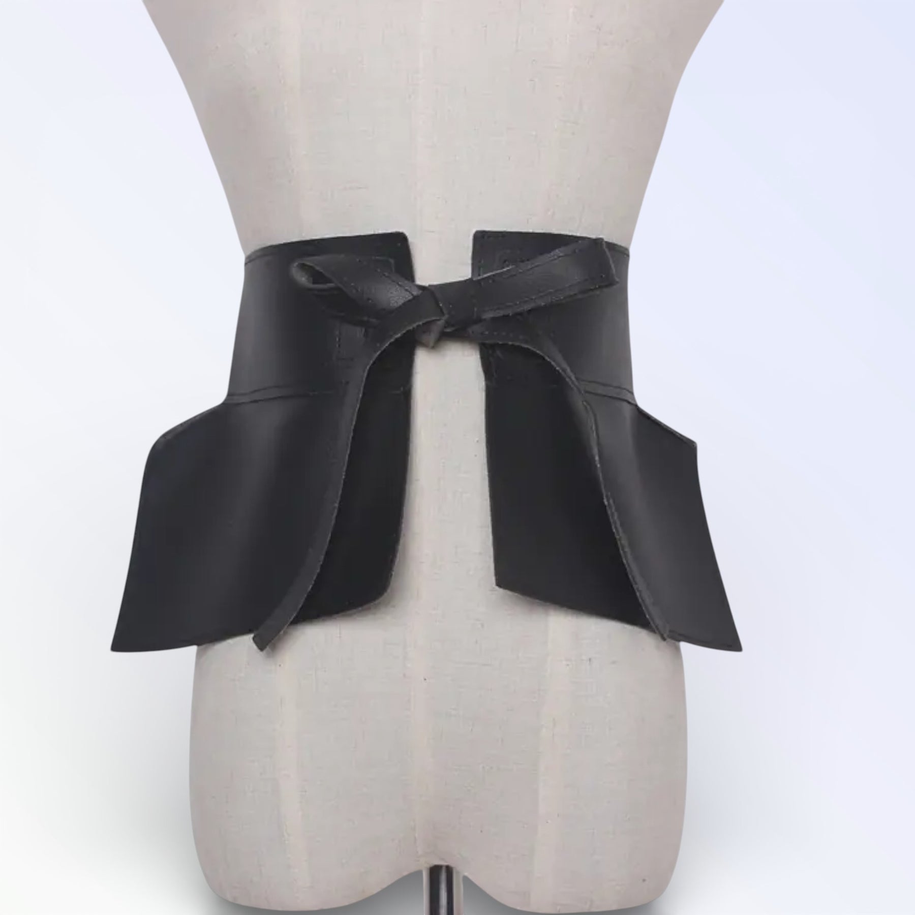 Cinto largo em preto, de efeito pele, que marca a cintura e cria uma silhueta elegante e bem definida.